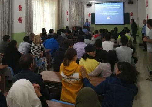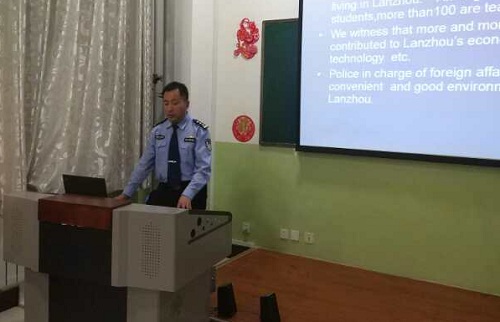 市公安局出入境管理处外管科科长蔡利成就禁毒戒毒、交通安全、签证管理、消防知识、预防网络诈骗、体检与传染性疾病预防与控制等内容,结合近期在兰高校国际学生中发生非法从业、人身伤害、疾病传染等案例强调进行了全面细致讲解,并就中秋、国庆国际学生旅行安全、预防网络诈骗进行了强调。