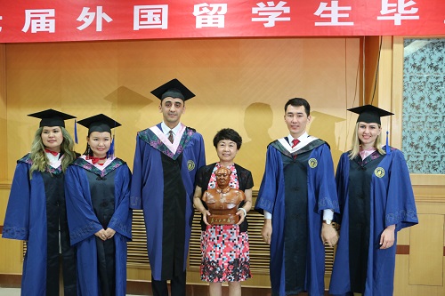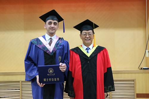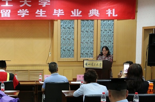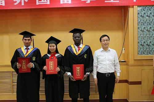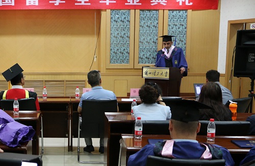 毕业典礼中,韦尧兵副校长为来自14个国家的37名来华留学研究生和本科生颁发了学位证。教务处处长韩建平、研究生院副院长刘军分别为优秀来华留学毕业生荣誉证书。文学院国际教育学院院长杨晓霭致辞,对留学生顺利完成学业表示祝贺,并表达了对大家的殷切期望和美好祝愿,期待包括“一带一路”沿线国家在内的所有国家留学生们能成为世界各国与中国友好交往的使者和桥梁。