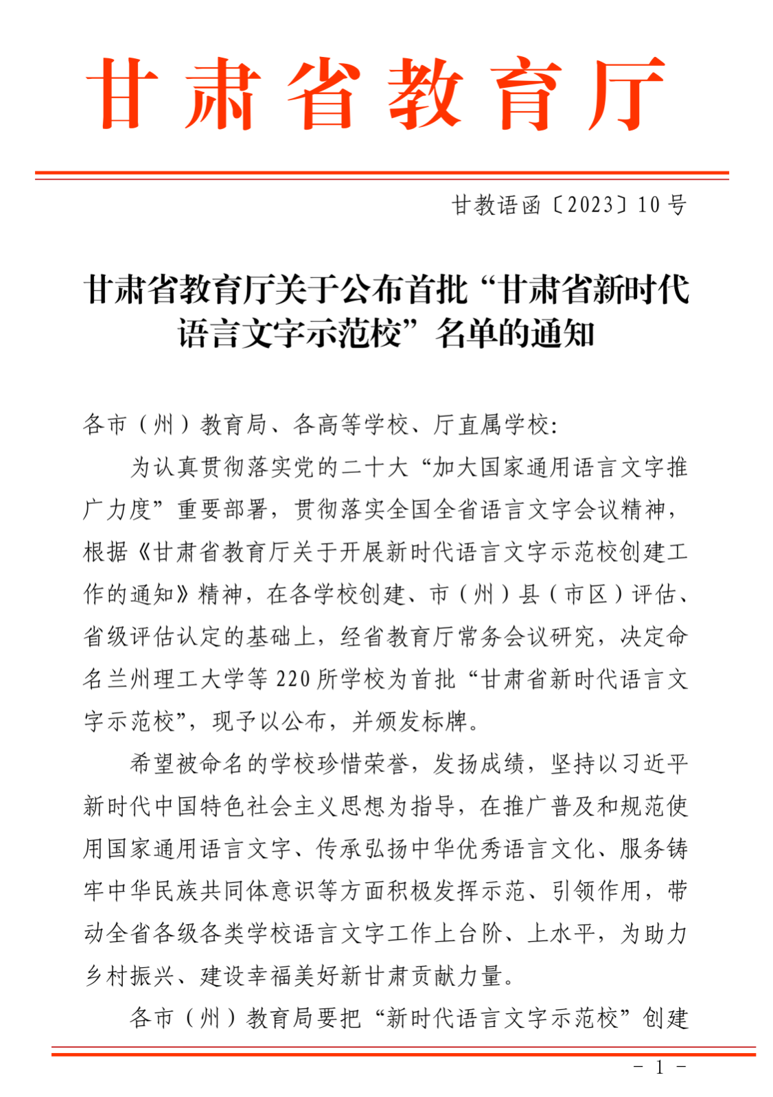甘肃省新时代语言文字示范校