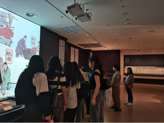 甘肃简牍博物馆是目前中国汉简藏量最大的专题类博物馆,在讲解员的专业解说下,同学们依次参观了“简牍时代”“简述丝路”“边塞人家”“书于简帛”四个展览单元,了解了简牍考古发现的历史、简牍中的丝路故事、汉代边塞人的日常生活、汉简中蕴含的书法艺术等方面的内容。大家认真聆听,仔细观看、用心品读、沉浸体验,从实物展示、图文解说、影像互动、场景复原中感受到现代科技与传统文化结合的魅力,体会简牍上承载的汉代灿烂文明和悠久文化历史,与此同时,也深深认识到作为未来国际中文教育者,肩负的文化传承传播的使命与责任。