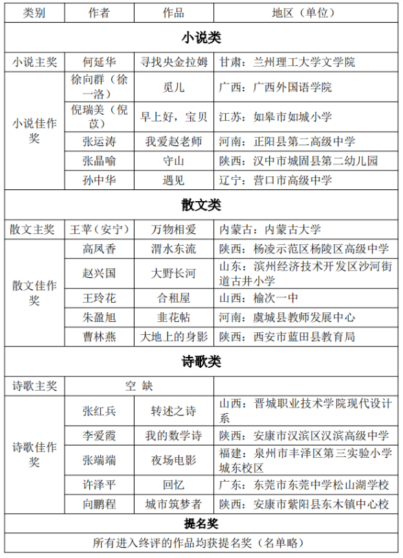 为繁荣文学艺术创作,展现新时代教育改革发展气象,讴歌新征程教育人的躬耕实践,《教师报》《自学考试报》《陕西教育杂志》等媒体联合陕西翰林教育研究院发起设立教师文学艺术奖。自2024年1月1日启动以来,第一届教师文学艺术奖共收到来自全国近30个省、市、自治区(不含港澳台地区)大中小学教师和教育工作者的小说集36部、单篇小说352篇,散文集45部、单篇散文544篇,诗歌集6部、单篇诗歌277人901首。历经9个月的初评、复评和终评环节,最终产生了17部(篇、首)获奖作品和36部(篇、首)提名作品。我校文学院何延华副教授的小说集《寻找央金拉姆》荣获小说奖唯一的主奖。
