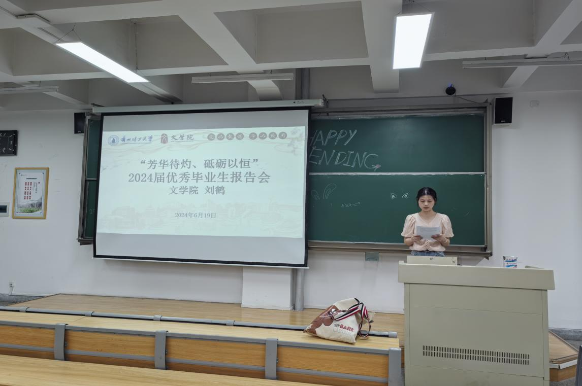 为充分发挥优秀毕业生的典型示范引领作用,引导低年级学生做好学业规划,营造良好学习氛围,兰州理工大学文学院于2024年6月19日下午在彭家坪校区观成楼205室举办了“芳华待灼、砥砺以恒”2024届优秀毕业生报告会,邀请兰州理工大学文学院2024届优秀毕业生代表刘鹤同学为文学院本科生同学做分享报告,汉语言文学专业23至21级本科生参加,报告会由院学生会主席王治凯主持,