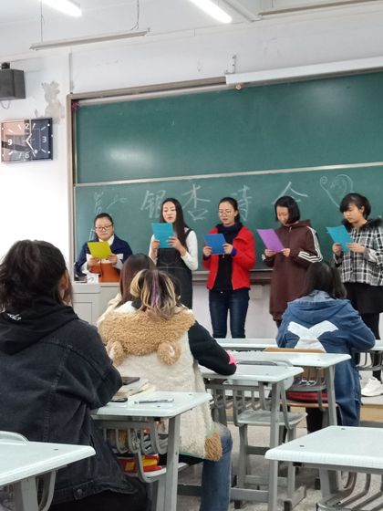 2018年10月17日,正值传统节日重阳节,2018级汉语言文学专业1班举办了“银杏诗会”团日活动。大家积极参加,表演丰富,体现了对活动的重视,展示了自己对诗歌浓厚的兴趣。诗会开始前,同学们先在银杏林挂宣传保护树木的文艺标牌,再集合到教室进行朗诵活动。活动朗诵部分由集体朗诵和个人朗诵组成,代表作品有:《重阳感怀》、《重阳登高》、《重阳之思》、《隽永小诗》、《重阳节抒怀》、《重阳节的菊花》等,活动期间还穿插了歌曲《明月几时有》、《主的终结》和小游戏,活动在热烈的气氛中圆满结束。