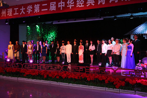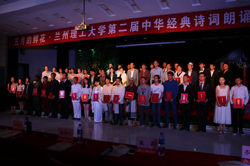 2015年5月29日晚,由校宣传部、学工部、校团委主办,文学院、国际教育学院、行星诗会承办的“五月的鲜花·兰州理工大学第二届中华经典诗词朗诵大赛”决赛在西校区大学生活动中心隆重举行。学校党委书记李贵富出席活动并向获奖选手颁奖。省教育厅副巡视员丁光明,国家级播音员、甘肃省广电总台新闻综合广播总监助理于芳、都市频道副总监王彤,国家级普通话水平测评员、兰州财经大学林雪红,兰州市清华小学校长张小瑞,校团委书记王正明、学校办公室调研员齐伟建、党委宣传部副部长高国礼、李建东,学工部副部长马凤英、处长助理张飞,团委副书记王文霞、孔德瑞,外国语学院党总支书记赵生吉、法学院党总支书记田波、能源与动力工程学院党委副书记高林学,文学院国际教育学院院长杨晓霭、书记任鹏、国家级普通话水平测评员戴莉等嘉宾和评委,以及全校师生600余人观看了比赛。